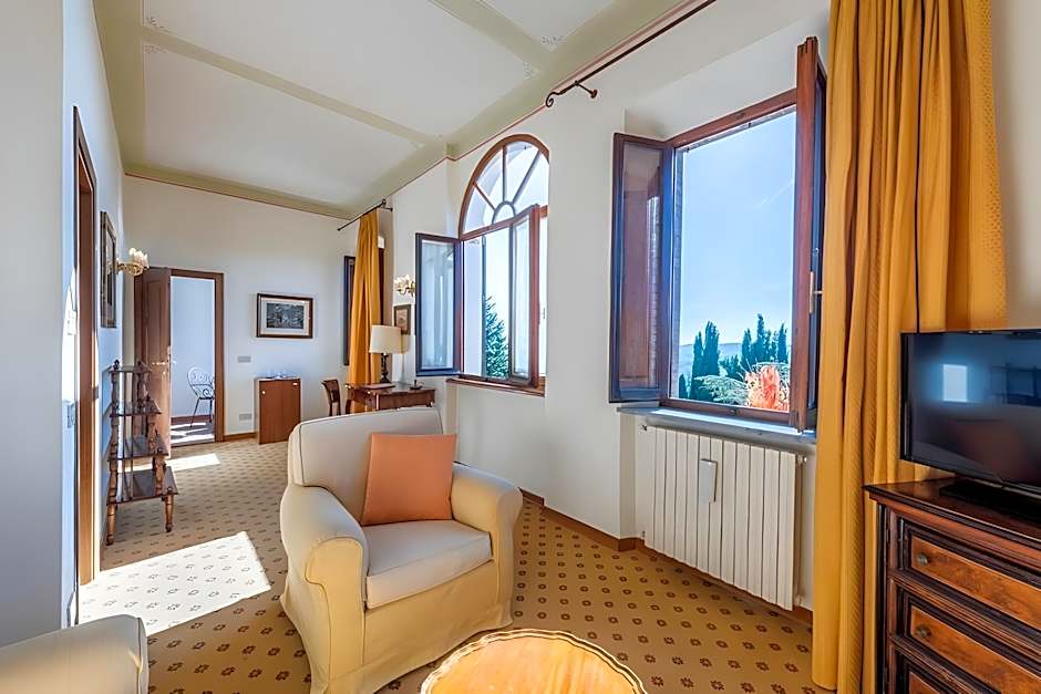 Spacious and elegantly furnished room with a large bathroom.